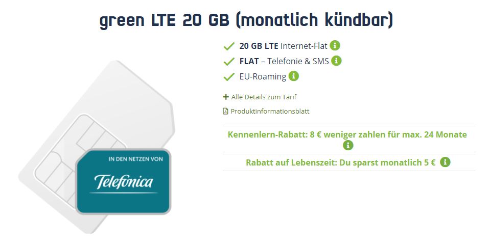 Monatlich kündbar! o2 green LTE Tarif mit 20 GB Datenvolumen bei 225 Mbit/s, Allnet Flat, SMS Flat für nur 16,99 Euro mtl.