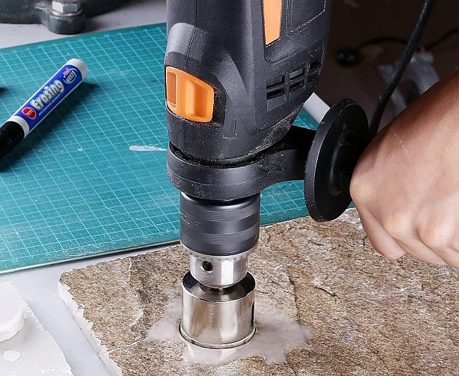 Tipp: Bohrer auf niedrige Drehzahl stellen und nur mit leichtem Bohrdruck arbeiten.