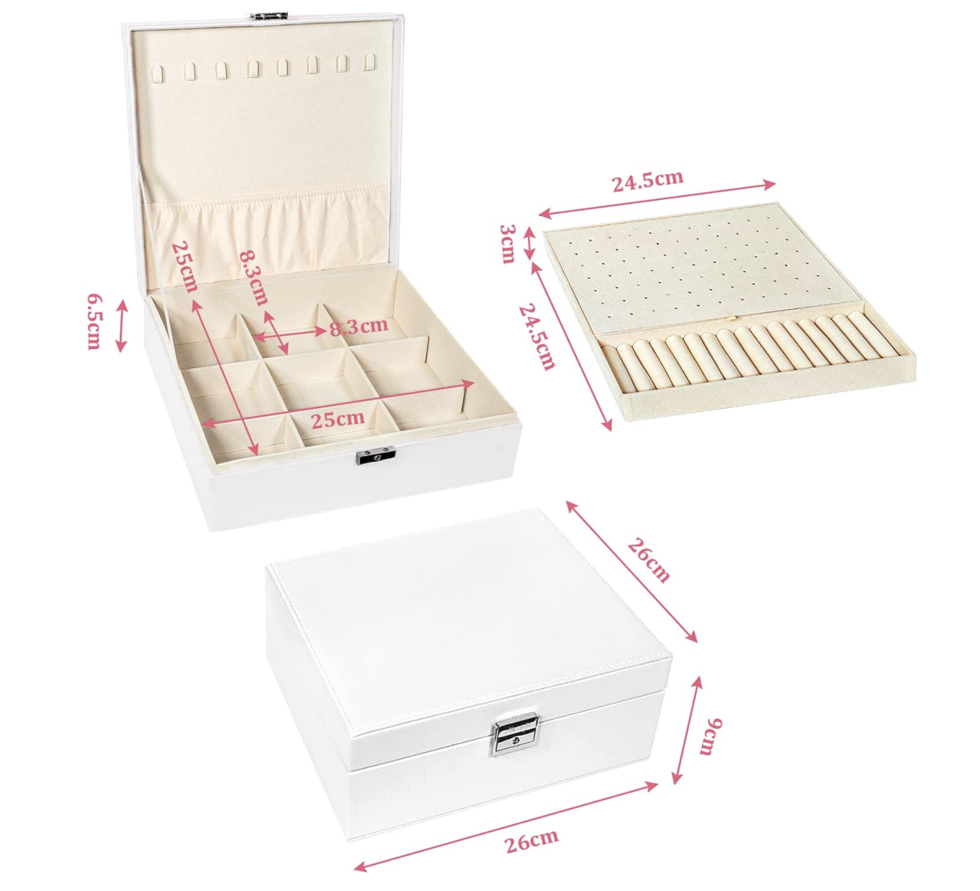 - Praktisches Layout: Mit 2 Schichten und verschiedenen Fächern können Sie Ihren Schmuck ordentlich organisieren. Die Trennwände beider Schichten sind abnehmbar. Sie können den Stauraum an Ihre Bedürfnisse nach verschiedenem Schmuck anpassen.
