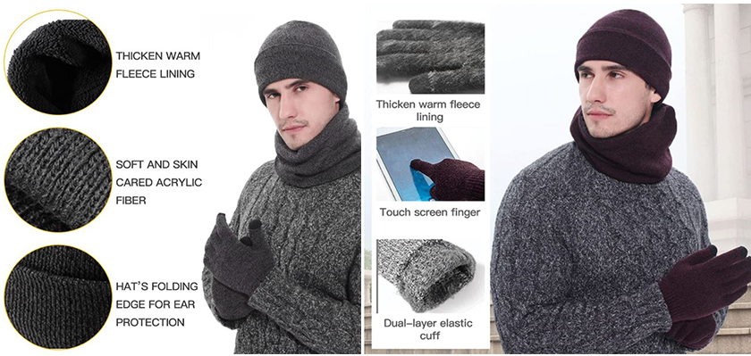 - Strickmützen, Schal und Handschuhe haben eine gewisse Elastizität. Sie bieten für die meisten erwachsenen Männer und Frauen eine perfekte Passform. Daumen, Zeigefinger und Mittelfinger des Handschuhs werden vom Bildschirm erkannt, sodass Sie Smartphones bedienen können