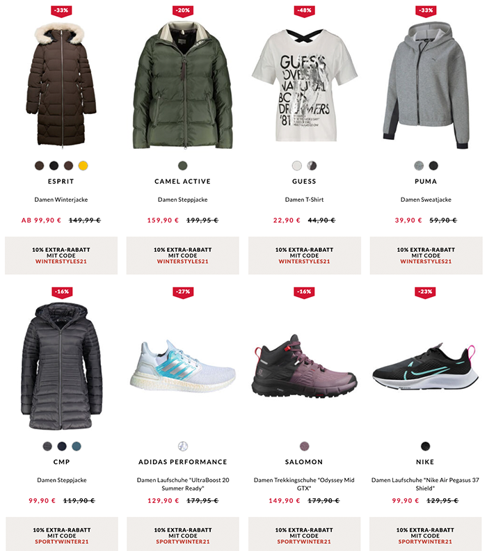 Um den Rabatt zu erhalten, nutzt ihr im Fashion Shop den Gutscheincode WINTERSTYLES21 und im Sports Shop den Code SPORTYWINTER21