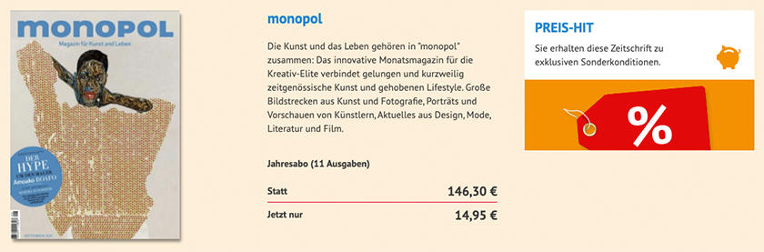 Im PresseShop erhaltet ihr zur Zeit das Jahresabo mit 11 Ausgaben der Zeitschrift Monopol für nur einmalig 14,95€ inkl. Zustellung.