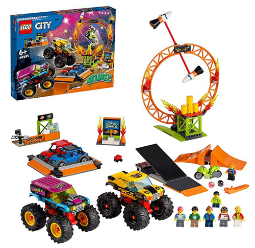 - Das LEGO City Stunt Show Arena Set setzt mit 2 Spielzeug-Monstertrucks, 2 Spielzeugautos mit Faltdächern, einem Feuerring und einem Spielzeugmotorrad die Szenerie in Szene