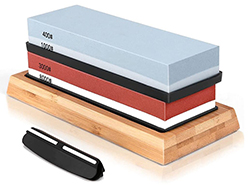 - Das 6-teilige Schärfset ist ausgestattet mit einem doppelseitigen (400/1000 3000/8000) hochwertigen Schärfstein, einer Bambusbasis zur Fixierung des Schärfsteins und einer Schärfwinkelführungsschiene.