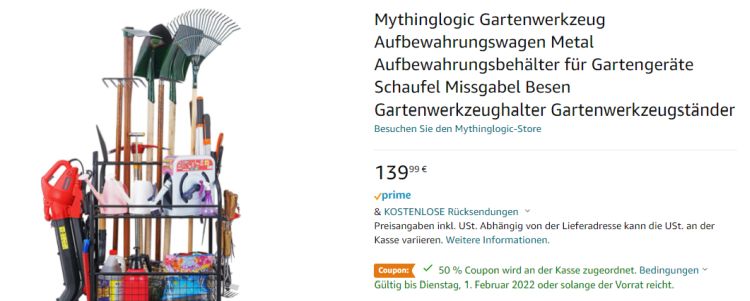 Im Preisvergleich gibt es den Mythinglogic Gartenwerkzeug-Aufbewahrungswagen sonst ab 139,99€ – ihr spart also 70€.