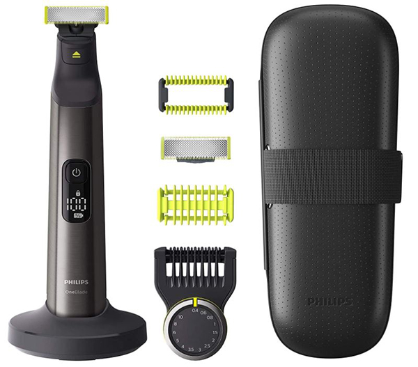 - Lieferumfang: OneBlade Pro Handstück, 2x Klingen, Präzisionstrimmer, Trimmaufsatz für den Körper, Hautschutzaufsatz, Standfuß & Reiseetui