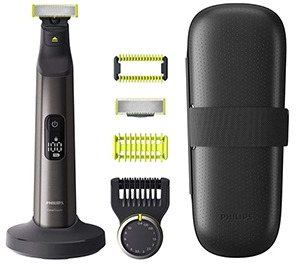 - Lieferumfang: OneBlade Pro Handstück, 2x Klingen, Präzisionstrimmer, Trimmaufsatz für den Körper, Hautschutzaufsatz, Standfuß & Reiseetui