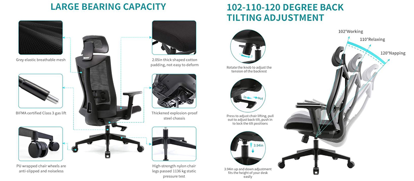 - Die dreistufige Stahl-Gasdruckfeder hochbelastbare Nylonbeine mit einer Tragfähigkeit von 150 kg sind BIFMA- und SGS-zertifiziert. Das verdickte, explosionsgeschützte Stahlgestell ist strapazierfähig. All diese Details machen diesen Bürostuhl länger nutzbar. Die leisen, PU-ummantelten Rollen lassen sich problemlos um 360° drehen und sind für fast alle Böden geeignet.