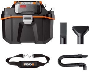 Der Staubsauger wird von den 20V WORX Systemakkus betrieben und kann dank Schultergurt bequem transportiert werden. Das Fassungsvermögen liegt bei 8 Liter (trocken) bzw. 3 Liter (nass).
