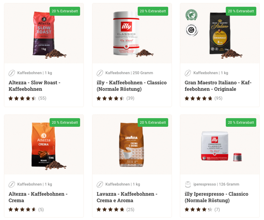 Zur Auswahl stehen euch auf der Aktionsseite über 200 verschiedene Kaffeesorten. Beachtet bitte, dass die Preise trotz Extra-Rabatt nicht zwingend Bestpreise sein müssen. Macht also im besten Falle vorher noch einen Preisvergleich.