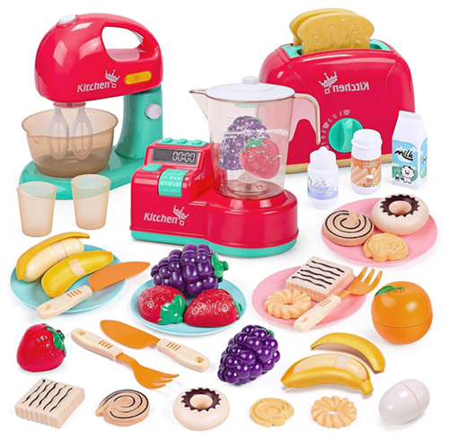 - Spielzeugküchen-Set mit realistischen Nachbildungen von Mixer, Toaster, und Schneidegerät für Lebensmittel