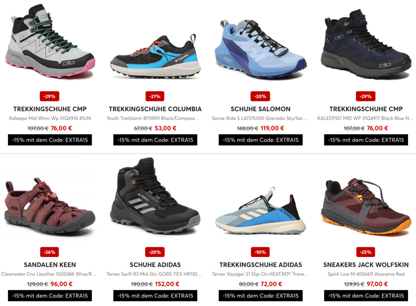 Zur Auswahl stehen euch auf der Aktionsseite rund 1.400 verschiedene Modelle namhafter Hersteller, wie beispielsweise Adidas, Columbia, Jack Wolfskin oder Salomon.
