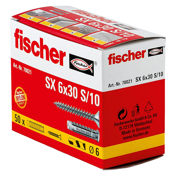 - Lieferumfang: 1 x Faltschachtel Spreizdübel SX (Art.-Nr. 70021), Karton mit Nylon-Allzweckdübeln (50 Stk. 6 x 30) sowie passenden Schrauben (50 Stk. 4,5 x 40) von fischer