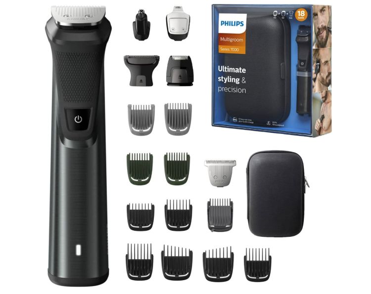 - Lieferumfang: Series 7000 Multigroom, 18 Tools, Reinigungsbürste, 11 Kämme, Trimmer, Ladekabel