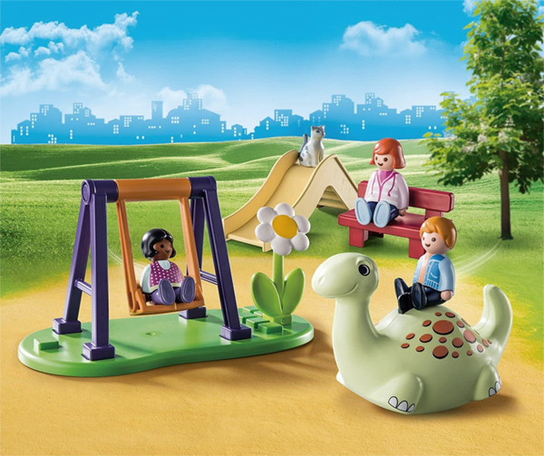 • Lieferumfang: 1x PLAYMOBIL 1.2.3 Spielplatz, 10-teiliges Spielfiguren-Set mit Anleitung: 1 Rutsche, 1 Schaukel-Dino, 1 Schaukel, 3 PLAYMOBL 1.2.3 Figuren, 1 PLAYMOBIL Tier, 3 Zubehörteile, Material: BPA-freier Kunststoff