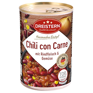 Für Freunde pikanter Eintöpfe gibt es bei Amazon aktuell das DREISTERN Chili con Carne in der 400 g Dose für nur 1,89€ inkl. Prime-Versand.
