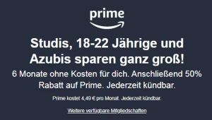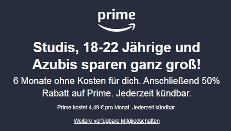 Wenn du Student, Azubi oder vom Rundfunkbeitrag befreit bist, bekommst du Amazon Prime wie gewohnt 6 Monate kostenlos – und danach weiterhin zum vergünstigten Preis von nur 4,49 € im Monat.