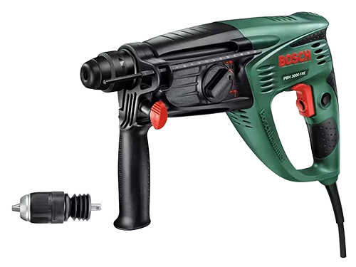 - Lieferumfang: Bosch PBH 3000 FRE, Kunststofftasche, Flachmeißel, Zusatz-Bohrfutter für zylindrische Schäfte, 4 SDS-Bohrer (5/6/8/10 mm), Tiefenanschlag, Zusatzhandgriff