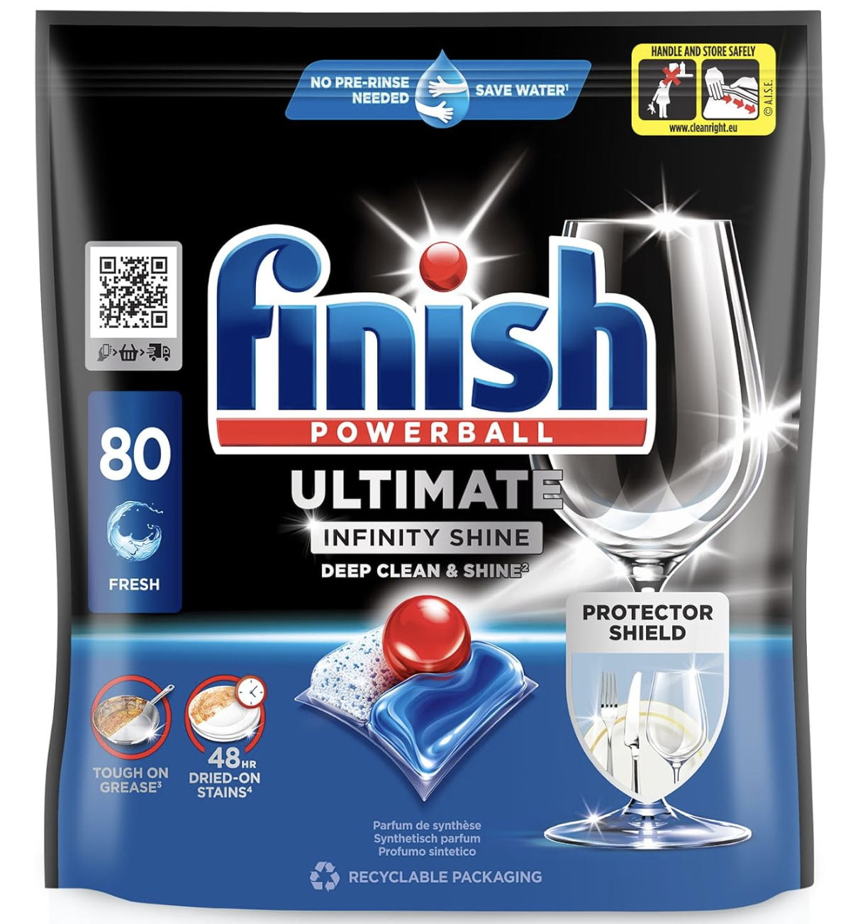 - LIEFERUMFANG: 80x Finish Ultimate Infinity Shine Geschirrreiniger im wiederverschließbaren, recycelbaren Standbodenbeutel / Geschirrtabs für brillante Spülergebnisse
