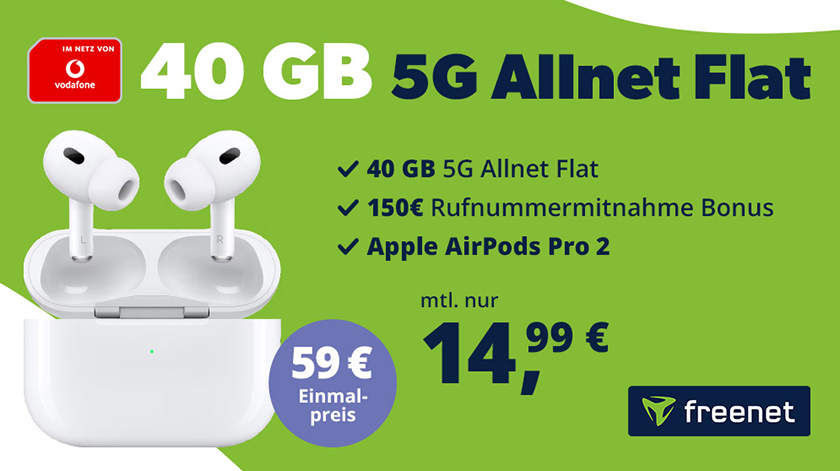 Oben drauf gibt es für 59€ Zuzahlung die AirPods Pro der 2. Generation und 150€ Bonus, wenn ihr eure bisherige Rufnummer mitnehmt! Alle Infos zu den Bonus-Bedingungen findet ihr unten.