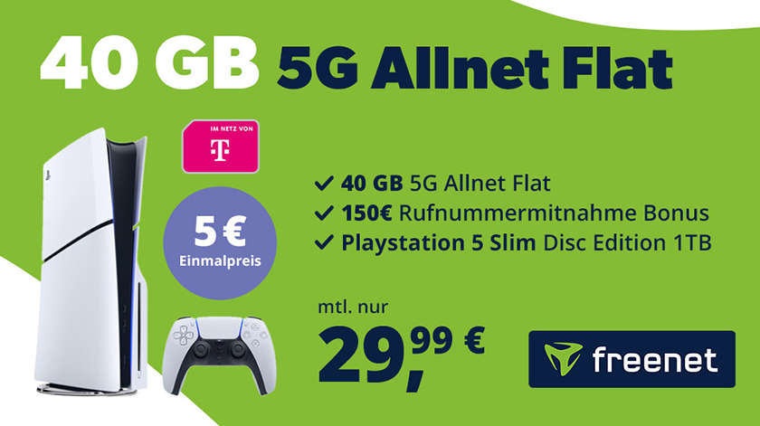Aber das ist natürlich nicht alles. Oben drauf erhaltet ihr als Hardware-Zugabe für einmalig 5€ die Sony Playstation 5 in der Slim Disc Edition und weitere 150€ Bonus, wenn ihr eure bisherige Rufnummer mitnehmt! Alle Infos zu den Bonus-Bedingungen findet ihr unten.