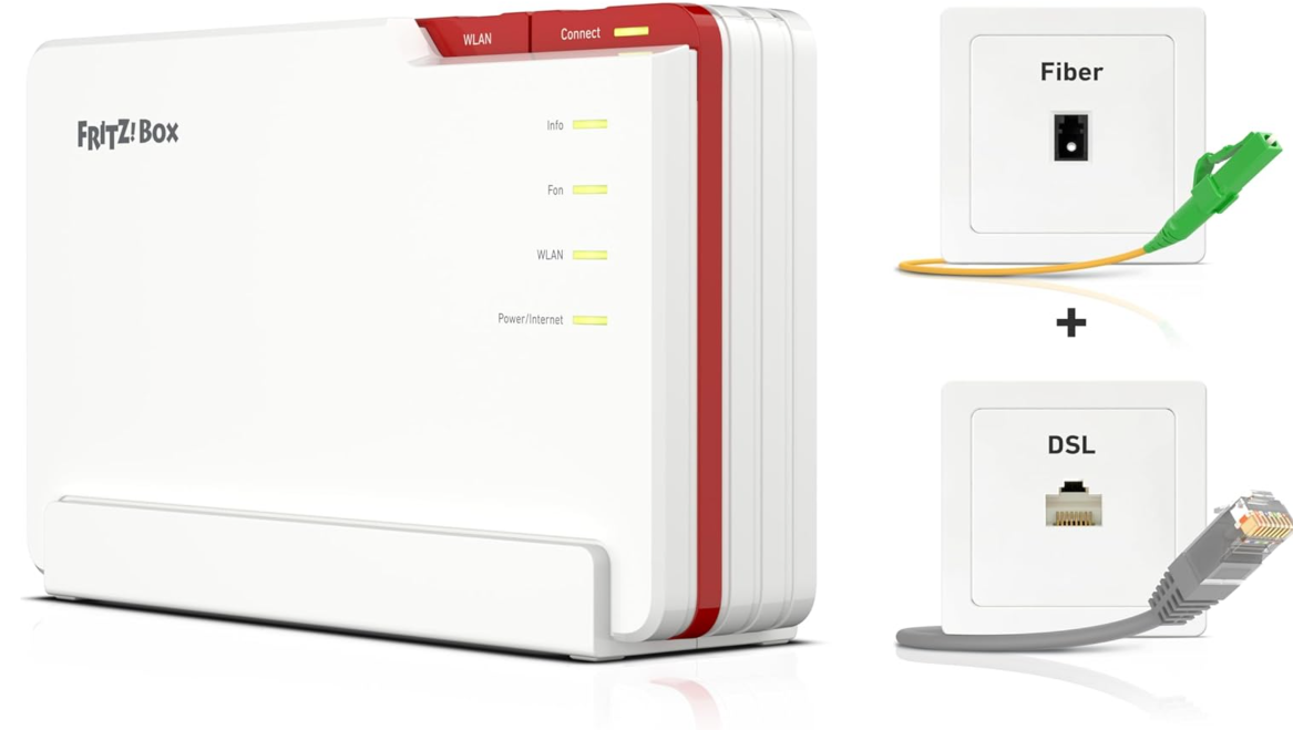 - Premium-Router mit Flexibilität am Anschluss: unterstützt die Glasfaserstandards GPON bis 2,5 GBit/s und AON bis 1 GBit/s sowie DSL inklusive Supervectoring 35b bis 300 MBit/s