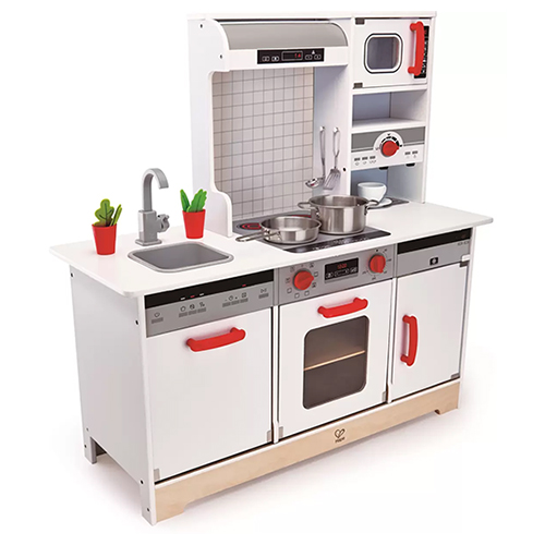 - Kinder werden von dieser umfangreichen Allzweck-Küche und ihren verschiedenen Geräten und Funktionen – einschließlich einer einstellbaren Lampe an der Dunstabzugshaube und authentischem Mikrowellen-Signal – begeistert sein