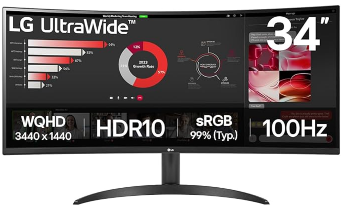 - 86,42 cm (34″) Monitor in nahezu rahmenlosem, schlankem Design / UltraWide 21:9-Format für eine gigantische Bildschirmfläche / QHD-Auflösung (3.440 x 1.440 Pixel)