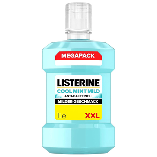Listerine soll laut Hersteller bis zu 97 % der Bakterien nach dem Zähneputzen entfernen. Die Variante „Cool Mint“ ist alkoholfrei und enthält ätherische Öle zur Unterstützung der Mundhygiene – empfohlen wird die Anwendung 2× täglich.