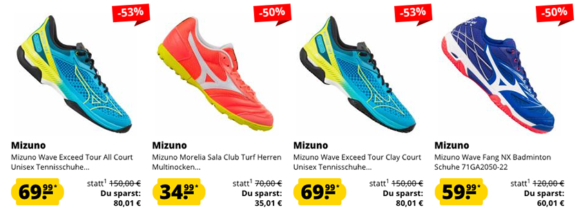 Bei SportSpar läuft aktuell einen tollen Mizuno Sale mit bis zu 59% Rabat auf viele verschiedene Sneaker und Sportschuhe.