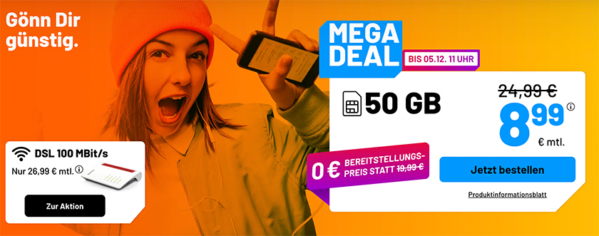 Bis morgen gibt es die neuen Sim.de Tarif-Angebote: Diese Woche bekommt ihr die Sim.de Allnet Flat im 1&1 5G Netz mit z.B. 50 GB Datenvolumen für nur 8,99€ monatlich.