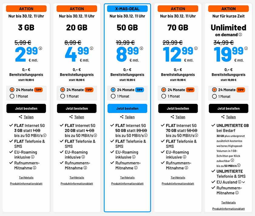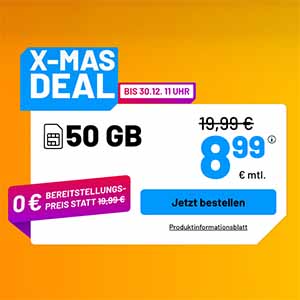 Bis morgen gibt es die neuen Sim.de Tarif-Angebote: Diese Woche bekommt ihr die Sim.de Allnet Flat im 1&1 5G Netz mit z.B. 50 GB Datenvolumen für nur 8,99€ monatlich.