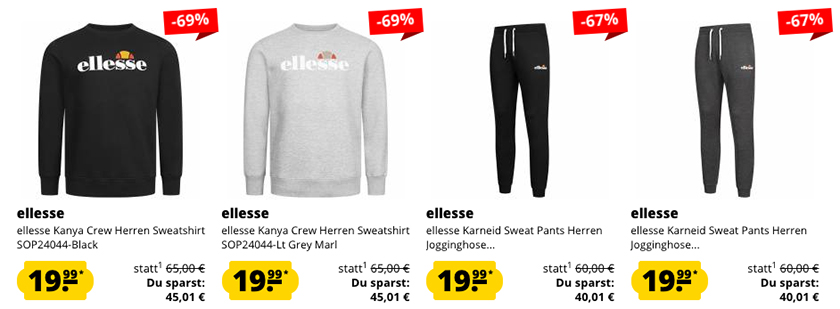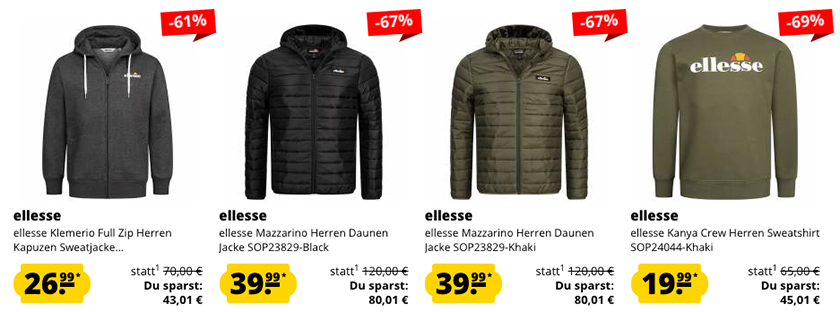 Ihr findet auf der Aktionsseite verschiedene Jacken, Pullover, Jogginghosen und vieles mehr von ellesse.