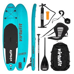 - Lieferumfang: Aufblasbares Supboard, Kajaksitz, Pumpe, Stabile Tragetasche, Knöchelgurt, Reparaturset, Flosse, Verstellbares Paddel