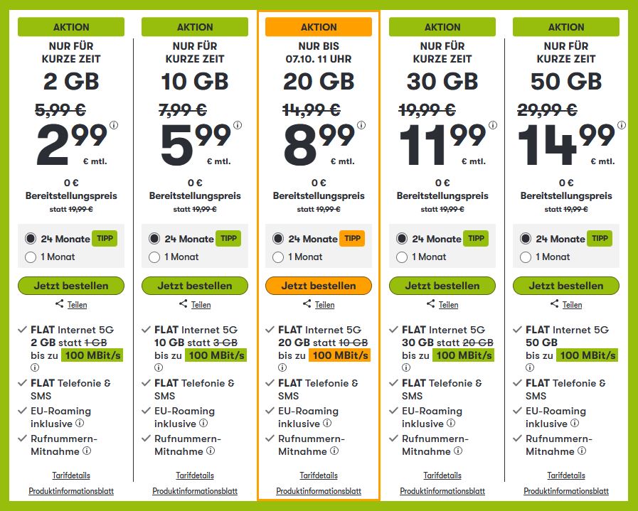 • FLAT Internet mit 2, 10, 20, 30 oder 50 GB LTE (bis zu 100 MBit/s)