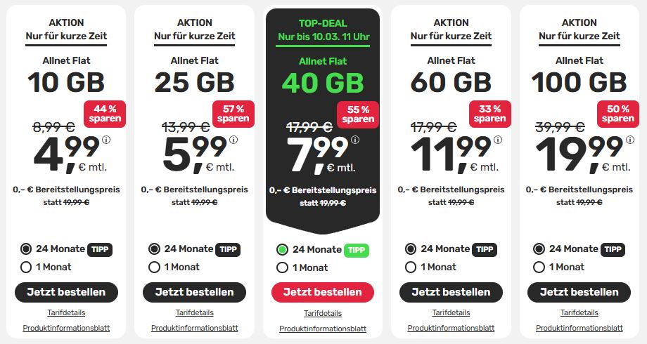 letztens erst 50gb mit 5g bis 100Mbit für ebenfalls 9,99 € abgeschlossen… also kein Deal hier :/
