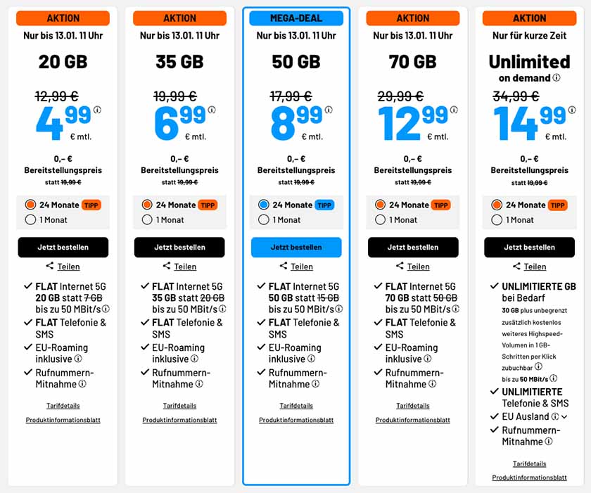 Bis morgen gibt es die neuen Sim.de Tarif-Angebote: Diese Woche bekommt ihr die Sim.de Allnet Flat im 1&1 5G Netz mit z.B. 50 GB Datenvolumen für nur 8,99€ monatlich.