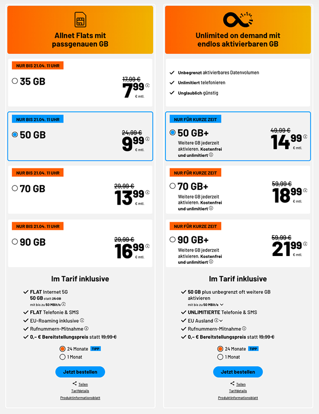Die Bereitstellungskosten entfallen bei der 24 Monats Variante. Bei den monatlich kündbaren Tarifen werden einmalig 9,99€ fällig.