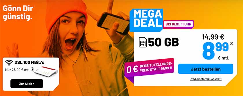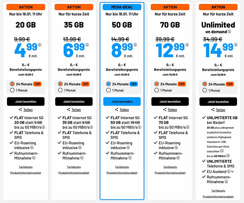 Bis morgen gibt es die neuen Sim.de Tarif-Angebote: Diese Woche bekommt ihr die Sim.de Allnet Flat im 1&1 5G Netz mit z.B. 50 GB Datenvolumen für nur 8,99€ monatlich.