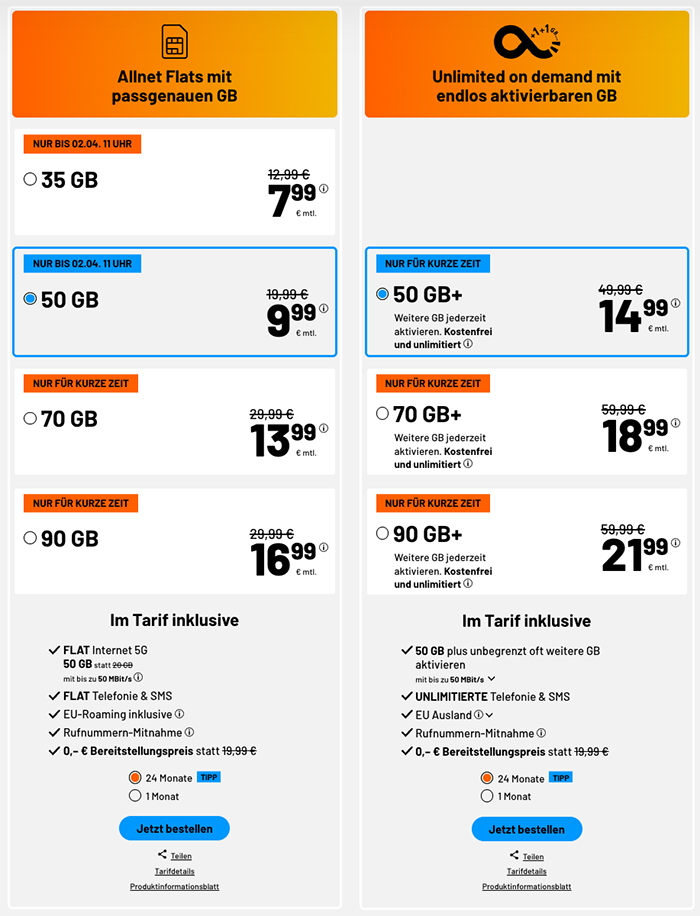 Die Bereitstellungskosten entfallen bei der 24 Monats Variante. Bei den monatlich kündbaren Tarifen werden einmalig 9,99€ fällig.