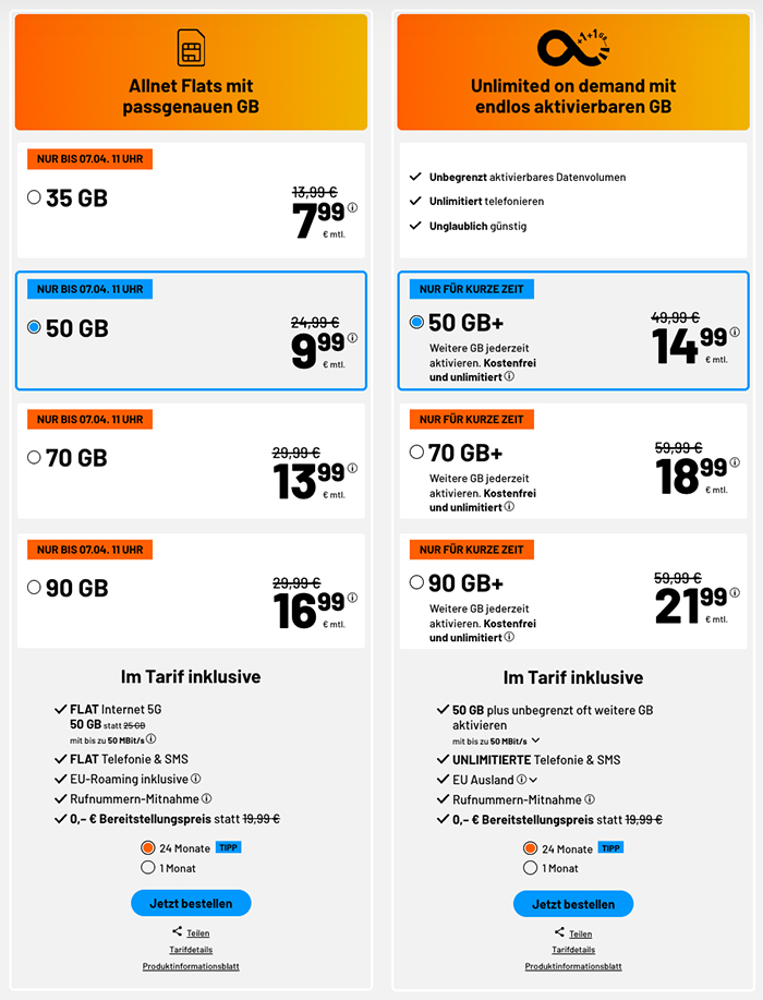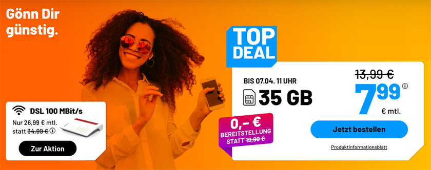 Bis morgen gibt es die neuen Sim.de Tarif-Angebote: Diese Woche bekommt ihr die Sim.de Allnet Flat im 1&1 5G Netz mit z.B. 35 GB Datenvolumen für nur 7,99€ monatlich.