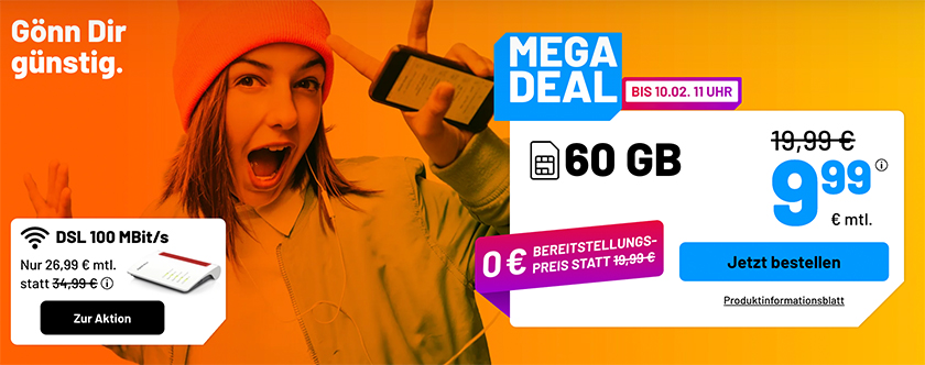 Bis morgen gibt es die neuen Sim.de Tarif-Angebote: Diese Woche bekommt ihr die Sim.de Allnet Flat im 1&1 5G Netz mit z.B. 50 GB Datenvolumen für nur 8,99€ monatlich.