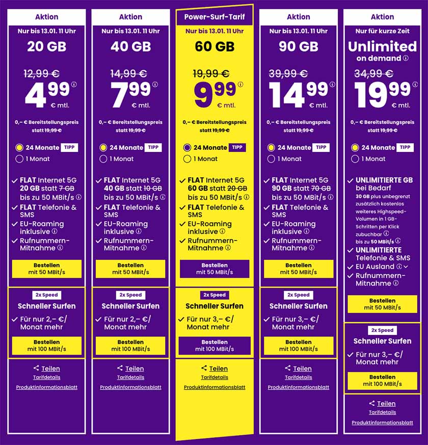 - Flat Internet mit 20, 40, 60, 90 GB bzw. Unlimited 5G (bis 100 Mbit/s)