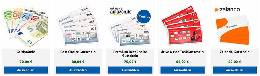 Es stehen wie üblich mehrere Prämien zur Auswahl: Ihr könnt z.B. einen 80€ Zalando Gutschein, einen 80€ Best-Choice-Gutschein oder aber einen Verrechnungsscheck über 70€ wählen.