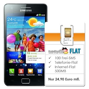 - Lieferumfang: Samsung Galaxy S II schwarz (Sim-Lock-Frei und ungebranded) + inaktive SIM-Karte ( nutzbar als Micro-SIM & normale SIM ) für DeutschlandSIM Flat-Tarif (auch zu einem späteren Zeitpunkt aktivierbar)