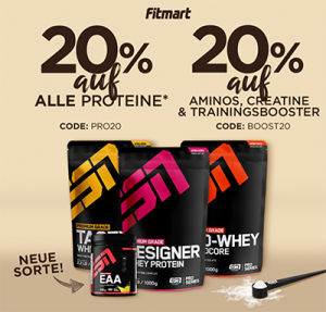 20% auf alle ESN Produkte und 20% auf alle Aminosäuren, Creatine und Booster bei Fitmart