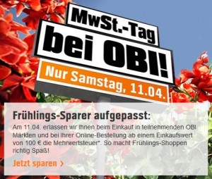 Mehrwertsteuer sparen bei Obi: Nur heute ab 100,- Euro MBW 19% MwSt. sparen
