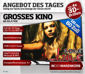 FETTES Kino! Bei 004.de (ehemals T-Online Shop) bekommt ihr heute den LG 60LA7408 3D EDGE LED-TV 60″ (152CM), 800HZ, DVB-C/S2/T, SMART TV für nur 1.749,- Euro...