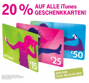 Bei der Telekom gibt es ab heute bis zum 28. Mai 2013 20% Rabatt auf ALLE iTunes Geschenkkarten – ihr zahlt daher nur 20,- Euro...