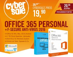 Bei Cyberport bekommt ihr heute im Cybersale Microsoft Office 365 Personal + F-Secure Anti-Virus 2016 (1PC – 1Jahr) für nur 19,90 Euro inkl. Versand. Im Vergleich...